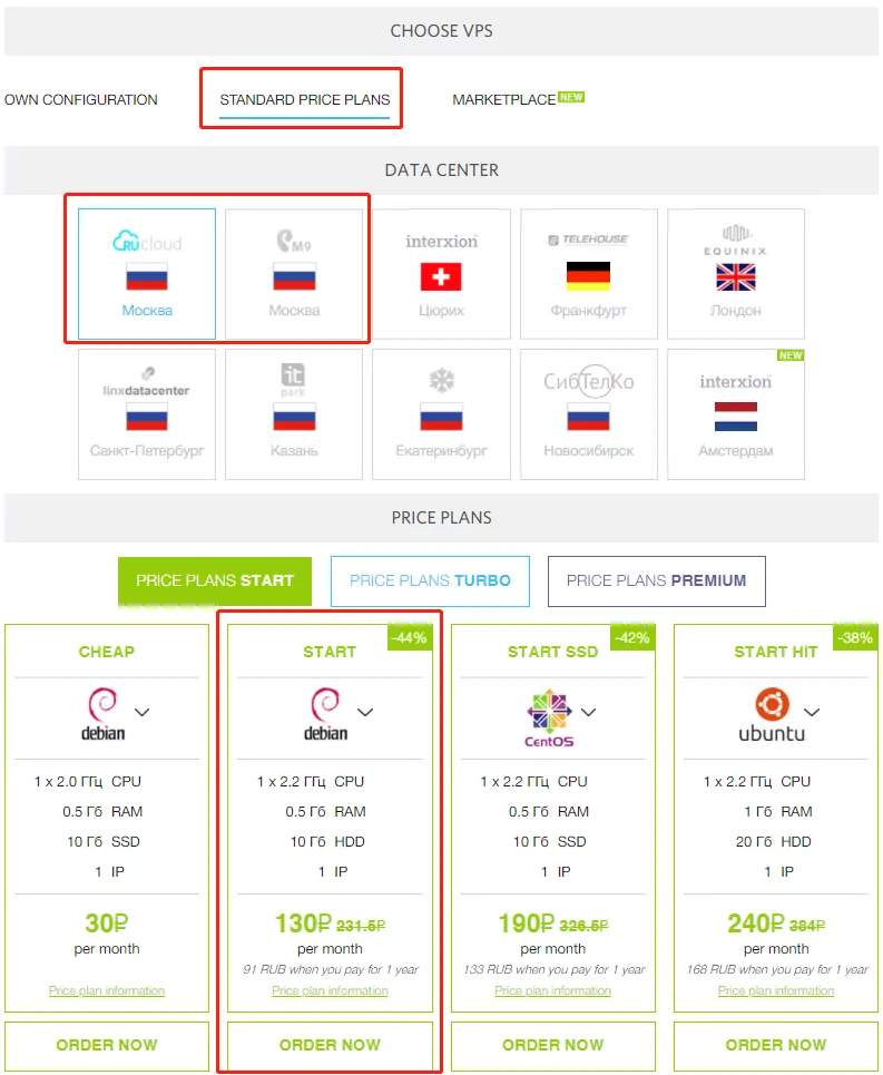 Choose one of the first 2 locations under the "STANDARD PRICE PLANS" tab, choose the 130₽ STARTER plan.
